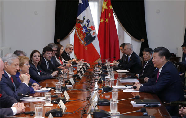 11月22日,國家主席習(xí)近平在圣地亞哥同智利總統(tǒng)巴切萊特舉行會談。(新華社記者 鞠鵬 攝)
