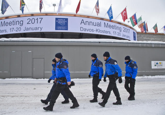 1月15日,在瑞士達(dá)沃斯,警察走過即將舉辦世界經(jīng)濟(jì)論壇年會的會議中心。(新華/美聯(lián))