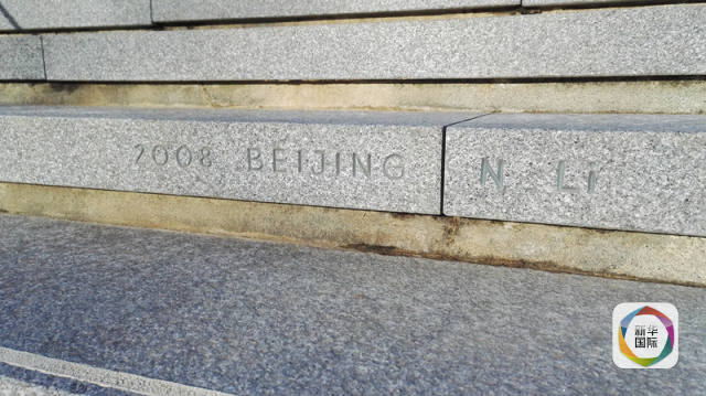 刻著北京奧運(yùn)會(huì)最后一棒火炬手李寧名字的臺(tái)階。新華社記者高鵬攝