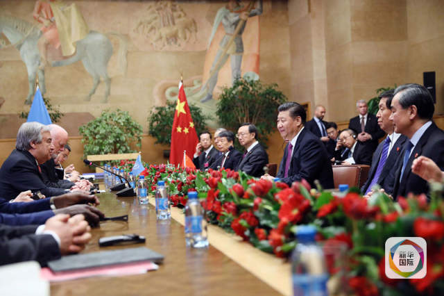 1月18日,國家主席習(xí)近平在瑞士日內(nèi)瓦萬國宮會(huì)見第71屆聯(lián)合國大會(huì)主席湯姆森和聯(lián)合國秘書長古特雷斯。(新華社記者蘭紅光攝)