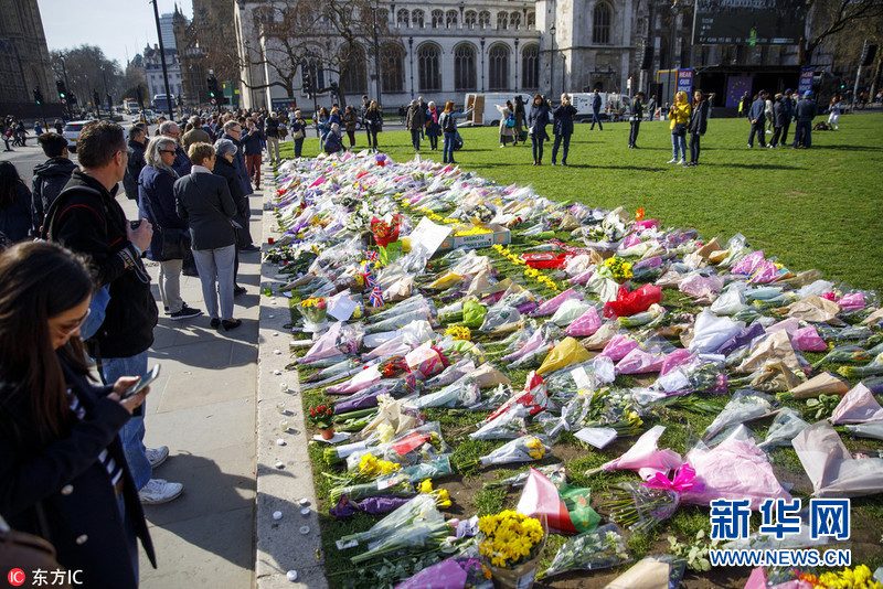 當(dāng)?shù)貢r間2017年3月25日,英國倫敦,民眾在議會外擺放鮮花,哀悼恐襲受害者。圖片來源:東方IC