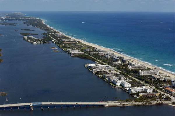 這是2017年3月20日航拍的美國佛羅里達州棕櫚灘的海岸線,海湖莊園就在這個狹長的小島上。(新華社記者殷博古攝)