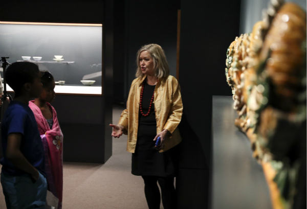 勞里·巴恩斯正在展館內(nèi)向小學(xué)生介紹中國文物。(新華社記者王迎攝)