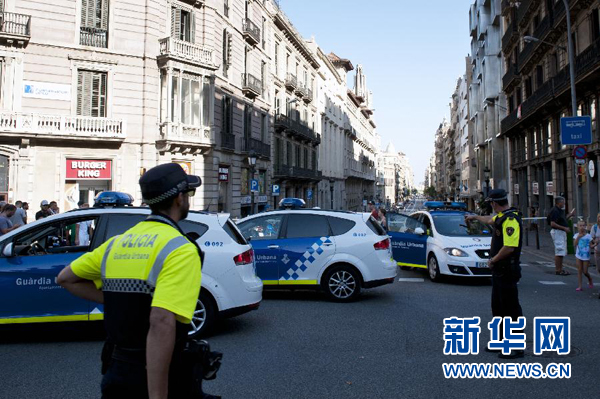 8月17日,在西班牙巴塞羅那,警方在發(fā)生汽車撞人恐怖襲擊事件后封鎖現(xiàn)場附近道路。西班牙巴塞羅那市所在的加泰羅尼亞自治區(qū)政府17日晚確認,巴塞羅那市當天發(fā)生汽車撞人的恐怖襲擊事件,現(xiàn)已造成13人喪生、80人受傷,其中15人重傷。新華社發(fā)(利諾·德瓦利耶攝)