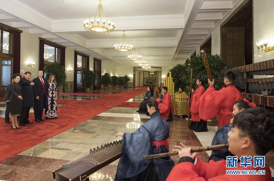 11月9日,國家主席習(xí)近平在北京人民大會堂東門外廣場舉行歡迎儀式,歡迎美利堅合眾國總統(tǒng)唐納德·特朗普對中國進(jìn)行國事訪問。這是習(xí)近平和夫人彭麗媛同特朗普夫婦在人民大會堂欣賞文藝表演。新華社記者 李學(xué)仁 攝