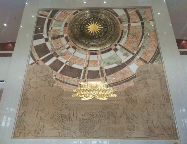 剛剛竣工的越中友誼宮,即將迎來一場盛大的落成移交儀式。記者抵達(dá)時,花匠們正在門口精心布置,用鮮花擺出中國和越南國旗的式樣。步入大廳,由中央美術(shù)學(xué)院歷時七個月設(shè)計(jì)的大型壁畫《山水相依 友誼長存》撲入眼簾——核心元素是中越古代共有的樂器“銅鼓”,寓意兩國文化交融源遠(yuǎn)流長。畫面中下部是身著傳統(tǒng)服飾的中越民眾形象,或翩翩起舞,或引吭高歌,或手捧豐收果實(shí),喜樂祥和中傳遞著中越之間濃厚的情誼。