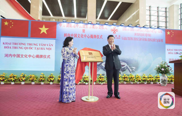11月12日,中共中央總書記、國家主席習近平在河內出席越中友誼宮落成移交儀式暨河內中國文化中心揭牌儀式。這是習近平和越南國會主席阮氏金銀共同為中國文化中心揭牌。新華社記者李濤攝