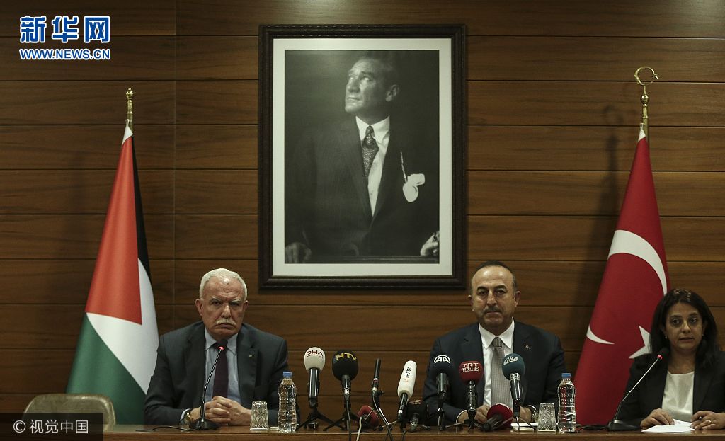 當(dāng)?shù)貢r(shí)間2017年12月20日,土耳其伊斯坦布爾,土耳其外長恰武什奧盧與巴勒斯坦外長馬勒基舉行聯(lián)合新聞發(fā)布會(huì),呼吁聯(lián)合國大會(huì)在21日舉行的緊急會(huì)議上認(rèn)定美國承認(rèn)耶路撒冷為以色列首都的決定“無效”。(圖片來源:視覺中國)