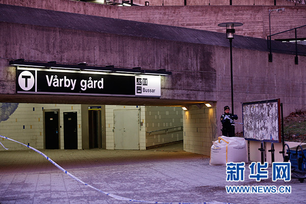 1月7日,在瑞典首都斯德哥爾摩南郊,警察封鎖地鐵站現(xiàn)場。新華社發(fā)(魏學(xué)超 攝)