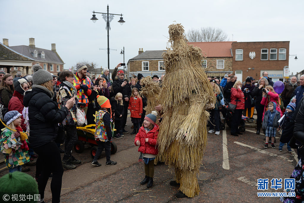 當(dāng)?shù)貢r間2018年1月13日,英國劍橋郡惠特爾西,民眾打扮成憨厚的“稻草熊”等各種形象,伴隨著樂隊的奏樂游行,慶祝第39屆惠特爾西“稻草熊”節(jié)。(圖片來源:視覺中國)