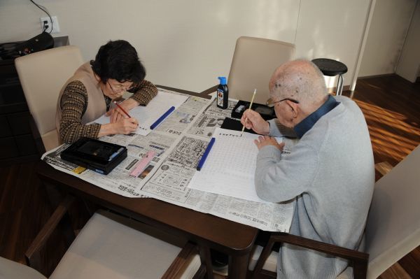 資料圖片:2017年2月27日,在位于日本東京品川區(qū)的養(yǎng)老院“日醫(yī)HOME南品川”,兩名老人在練習(xí)描字。新華社記者華義攝