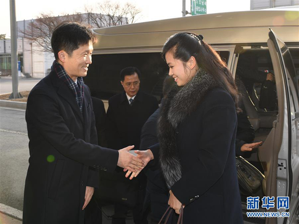 1月21日,朝鮮三池淵管弦樂團(tuán)團(tuán)長(zhǎng)玄松月(右)到達(dá)位于朝韓邊境的韓國(guó)京畿道坡州市京義線韓朝出入境事務(wù)所。新華社發(fā)(韓國(guó)統(tǒng)一部提供)