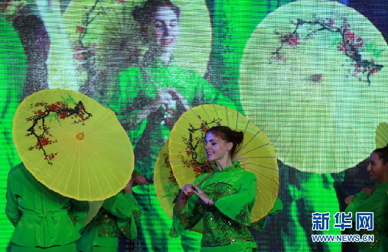 1月23日,烏克蘭基輔第一東方語(yǔ)言學(xué)校的學(xué)生表演傘舞。新華網(wǎng)發(fā)(陳俊鋒攝)
