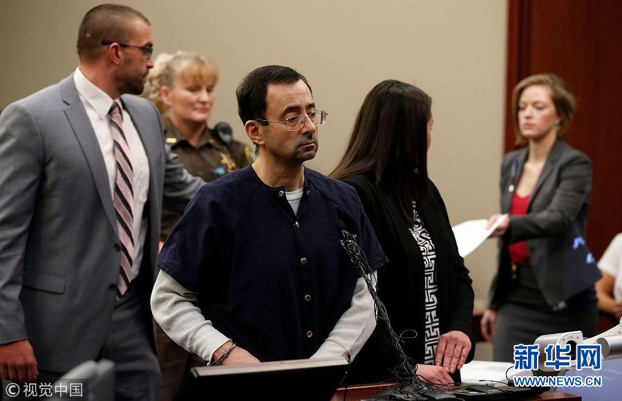1月24日,美國密歇根州蘭辛,美國奧運(yùn)體操隊(duì)前隊(duì)醫(yī)拉里·納沙因性侵被判處40-175年監(jiān)禁。過去7天,超過150名女性向法官證實(shí),自己曾是納沙的性侵對象,其中包括多名兒童。在法院宣讀的一份聲明中,納沙表示自己對受害者的歉意已“超出言語的表達(dá)范圍”。54歲的納沙1996年至2015年間在美國體操協(xié)會(huì)擔(dān)任醫(yī)師。(圖片來源:視覺中國)