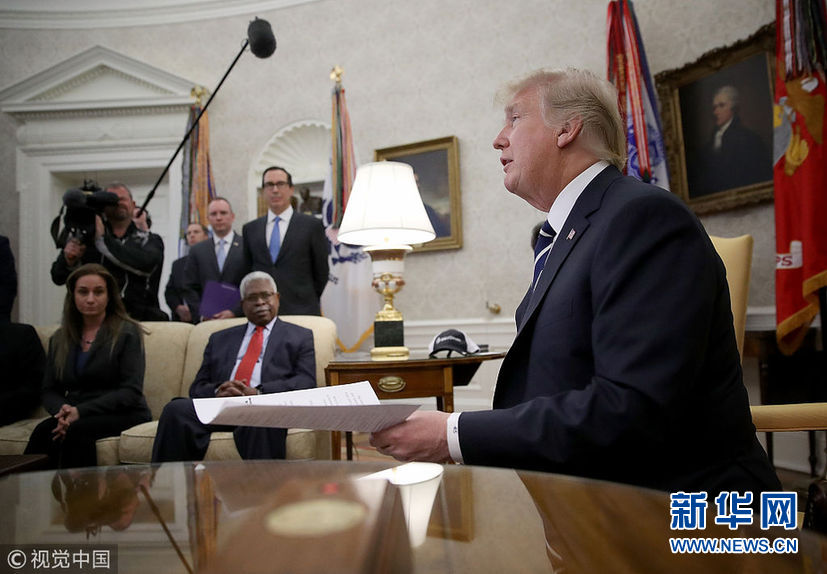 當(dāng)?shù)貢r(shí)間1月31日,美國華盛頓,美國總統(tǒng)特朗普在白宮與公司雇員討論稅收改革問題。(圖片來源:視覺中國)