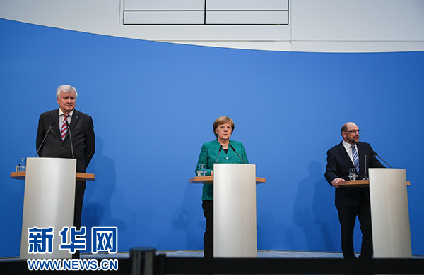??? 2月7日,在德國(guó)柏林的基民盟總部,德國(guó)總理、聯(lián)盟黨領(lǐng)導(dǎo)人默克爾(中),社會(huì)民主黨主席舒爾茨(右)和基社盟主席澤霍費(fèi)爾出席新聞發(fā)布會(huì)。據(jù)德國(guó)媒體報(bào)道,德國(guó)聯(lián)盟黨(由基民盟和基社盟組成)和社會(huì)民主黨(社民黨)7日就聯(lián)合組閣協(xié)議達(dá)成一致。 新華社記者單宇琦攝