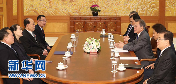 2月10日,在韓國首爾青瓦臺(tái),韓國總統(tǒng)文在寅(右三)會(huì)見由朝鮮最高人民會(huì)議常任委員會(huì)委員長(zhǎng)金永南(左三)率領(lǐng)的朝鮮高級(jí)別代表團(tuán)。新華社/紐西斯通訊社