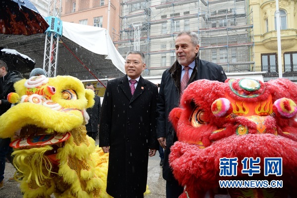 2月12日,中國(guó)駐克羅地亞大使胡兆明(左)與克首都薩格勒布市長(zhǎng)米蘭·班迪奇在薩格勒布出席為慶祝中國(guó)春節(jié)舉辦的舞獅表演活動(dòng)。新華網(wǎng)發(fā)(高磊攝)