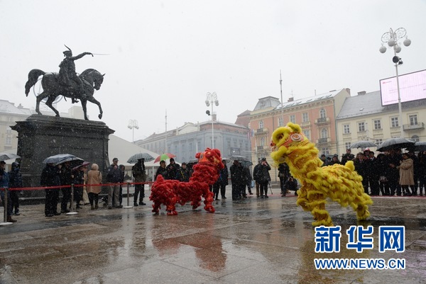 當(dāng)?shù)貢r(shí)間12日中午,來自斯洛伐克中國(guó)武術(shù)協(xié)會(huì)的舞獅表演隊(duì)冒雪表演傳統(tǒng)舞獅節(jié)目,中國(guó)駐克羅地亞大使胡兆明和薩格勒布市長(zhǎng)米蘭·班迪奇為舞獅點(diǎn)睛,熱鬧的鑼鼓和一紅一黃兩頭“獅子”吸引了大批市民駐足觀看。