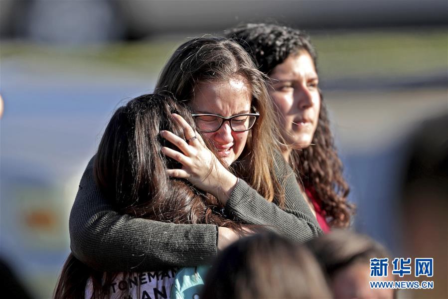 2月14日,在美國佛羅里達州帕克蘭市發(fā)生槍擊的高中,安全撤離的學(xué)生相擁而泣。美國佛羅里達州布勞沃德縣警方14日說,當(dāng)?shù)匾桓咧邪l(fā)生的槍擊案已造成17人死亡。 新華社/美聯(lián)