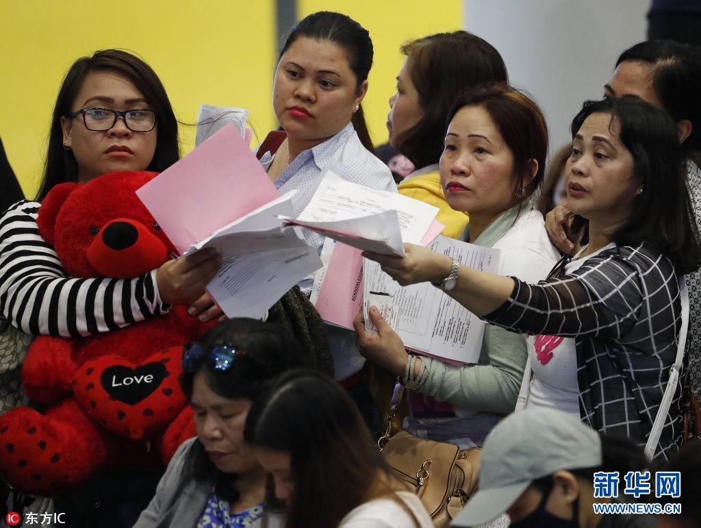 當?shù)貢r間2018年2月21日,菲律賓馬尼拉,從科威特返回的菲律賓海外勞工抵達馬尼拉國際機場。據(jù)外媒報道,宿霧太平洋航空公司為至少396名海外菲律賓工人提供空運支持,助其免費搭乘飛機回家。據(jù)悉,菲律賓政府已下令禁止民眾前往科威特務工。據(jù)悉,菲律賓總統(tǒng)杜特爾特稱,近來有在科威特打工的菲律賓女傭因不堪虐待或性侵選擇自殺。(圖片來源: 東方IC)