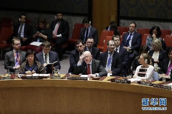 2月24日,在位于紐約的聯(lián)合國(guó)總部,俄羅斯常駐聯(lián)合國(guó)代表瓦西里·涅邊賈(前中)在安理會(huì)通過(guò)敘利亞全境停火決議草案后發(fā)言。新華社記者 李木子 攝