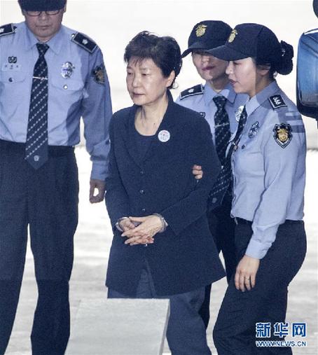 這是2017年5月23日韓國(guó)前總統(tǒng)樸槿惠(中)抵達(dá)首爾中央地方法院的資料照片。新華社發(fā)(李相浩攝)