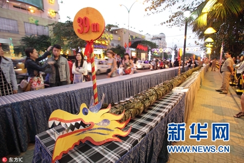 越南芽莊一酒店制作“長(zhǎng)龍”粽子慶祝新年。(圖片來(lái)源:東方IC)