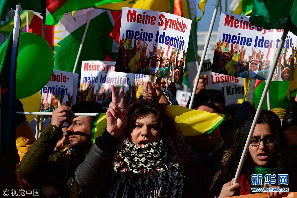當(dāng)?shù)貢r(shí)間2018年3月3日,德國(guó)柏林,當(dāng)?shù)孛癖娕e行游行,抗議土耳其對(duì)敘利亞阿夫林地區(qū)的庫(kù)爾德人采取軍事行動(dòng)。(圖片來(lái)源:視覺(jué)中國(guó))