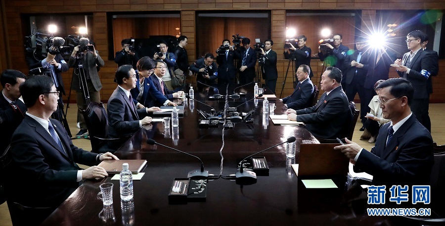 3月29日,在板門店朝方一側的統(tǒng)一閣,朝韓雙方代表參加高級別會談。