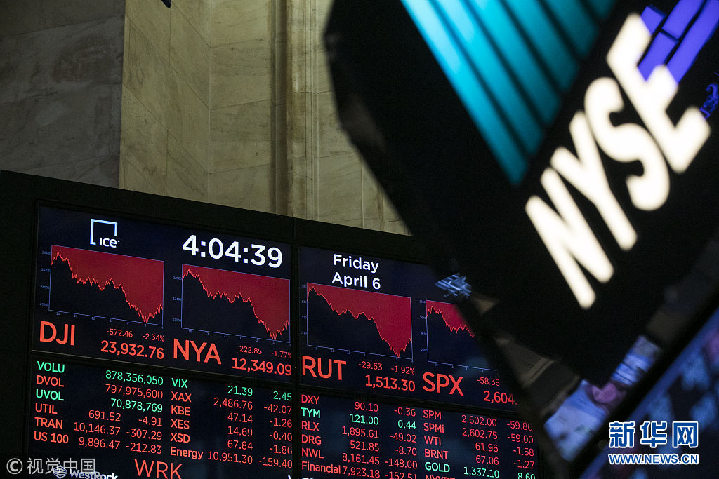 4月6日,美國紐約,紐約證交所。對中美貿(mào)易摩擦升級的擔(dān)憂6日彌漫華爾街,美股今天再度走低。道瓊斯工業(yè)指數(shù)當(dāng)天一度下挫接近800點。當(dāng)天,紐約股市三大股指全部收跌。道指報收于23932.76點,跌2.34%;標(biāo)準(zhǔn)普爾500指數(shù)收于2604.47點,跌2.19%;納斯達克綜合指數(shù)收于6915.11點,跌2.28%。(圖片來源:視覺中國)