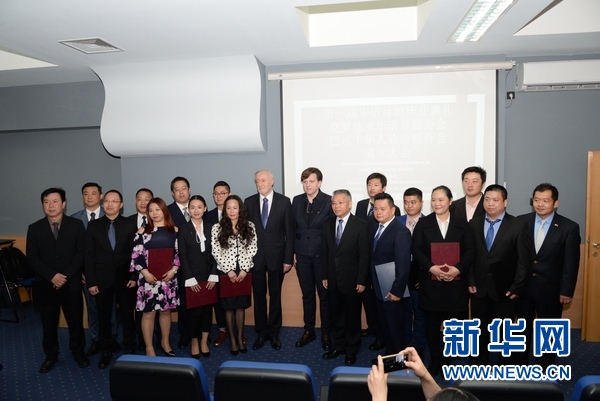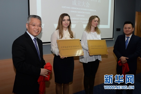 4月11日,中國駐克羅地亞大使胡兆明(左一)與克羅地亞華語導游協(xié)會會長蔣曉亮(右一)在薩格勒布為當天成立的克羅地亞華語導游協(xié)會和巴爾干華人旅游協(xié)會揭牌。新華社記者高磊 攝