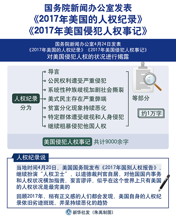 新華社北京4月24日電(記者黃小希、程卓)國(guó)務(wù)院新聞辦公室24日發(fā)表《2017年美國(guó)的人權(quán)紀(jì)錄》《2017年美國(guó)侵犯人權(quán)事記》,對(duì)美國(guó)侵犯人權(quán)的狀況進(jìn)行揭露。