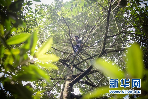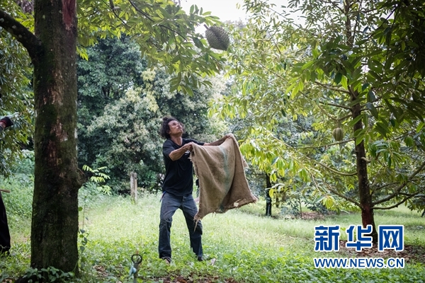 新華網曼谷4月24日電(陳家寶)23日清晨,在泰國曼谷以東約250公里的莊他武里府的果園里,綴滿榴蓮的高樹上,黝黑的果農爬上枝椏,割下一個個約3公斤重的果實。
