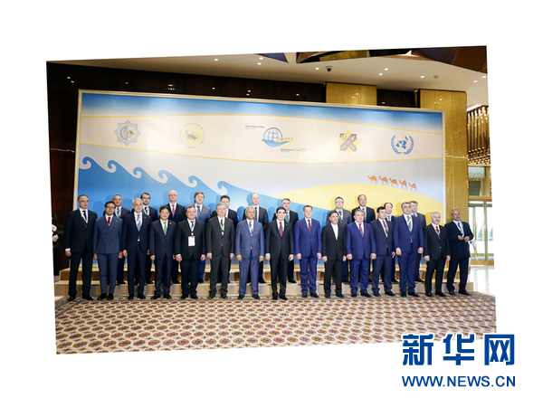 參加“偉大的絲綢之路——邁向新發(fā)展”國(guó)際論壇的貴賓同土庫(kù)曼斯坦總統(tǒng)別爾德穆哈梅多夫合影。新華社記者 周良攝