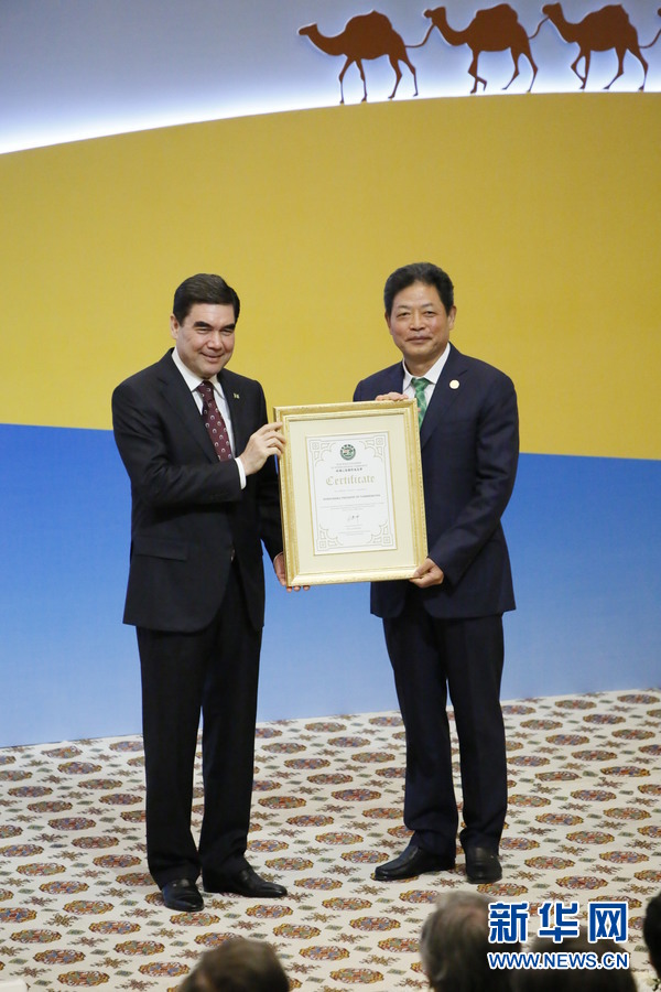 論壇開幕式上,絲綢之路國(guó)際總商會(huì)主席呂建中代表該商會(huì)向別爾德穆哈梅多夫頒發(fā)“復(fù)興絲綢之路榮譽(yù)證書”。新華社記者 周良攝