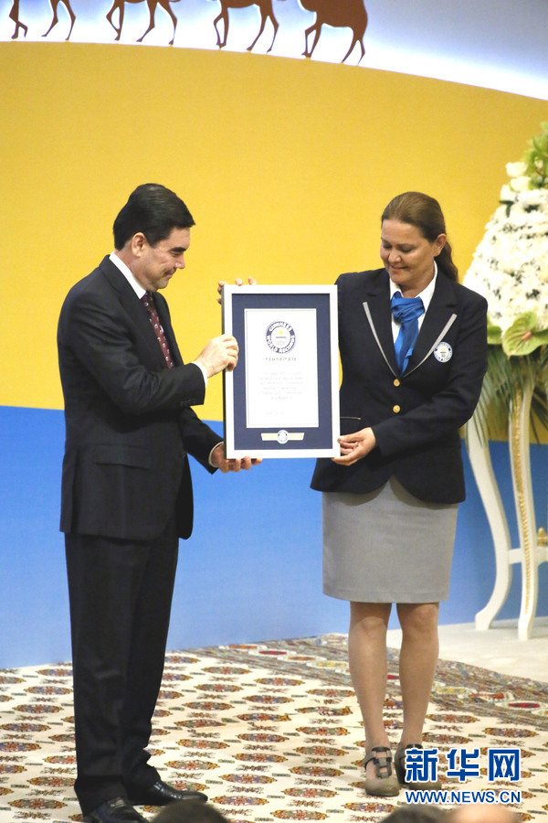 5月2日,世界吉尼斯紀(jì)錄總部的代表向土庫(kù)曼斯坦總統(tǒng)頒發(fā)相關(guān)證書。新華社記者 周良攝