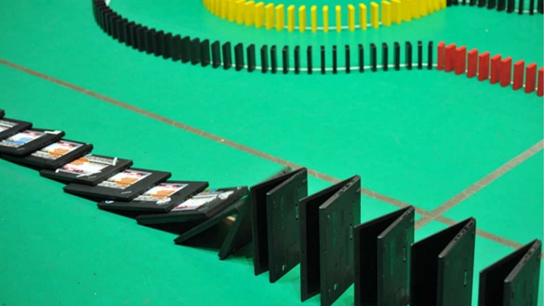 此次的多米諾挑戰(zhàn)除了520臺筆記本外,還準備了45000枚骨牌?;顒又黝}以及工程師們標志性的代碼都成為了多米諾骨牌整體設(shè)計的一部分。最終,所有多米諾骨牌和筆記本電腦全部被成功推倒。