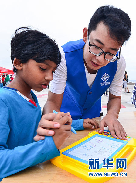5月4日,在馬爾代夫首都馬累市中心停機坪廣場,中國志愿者教當?shù)貎和瘜憹h字。新華社發(fā)(杜才良 攝)