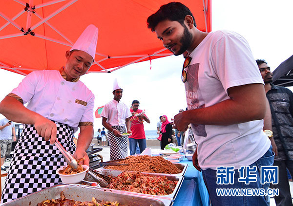 5月4日,在馬爾代夫首都馬累市中心停機坪廣場,一名當?shù)啬凶樱ㄓ遥┢穱L中國美食。 新華社發(fā)(杜才良 攝)