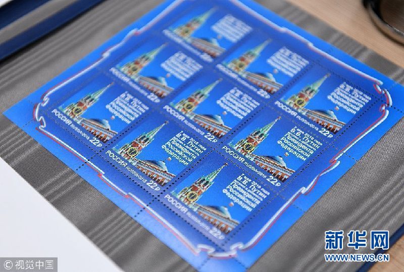 當(dāng)?shù)貢r間2018年5月7日,俄羅斯莫斯科,俄羅斯發(fā)行普京就職紀(jì)念郵票。(圖片來源:視覺中國)