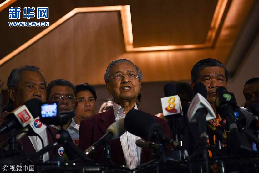 當?shù)貢r間2018年5月9日,馬來西亞吉隆坡,馬哈蒂爾代表希望聯(lián)盟召開新聞發(fā)布會。9日,馬來西亞國會大選結(jié)束。10日凌晨官方點票結(jié)果顯示,前總理馬哈蒂爾(Mahathir)帶領(lǐng)的希望聯(lián)盟取得112席簡單多數(shù)國會議席,足以籌組政府及勝出大選,并終結(jié)執(zhí)政國民陣線長達60年的管治?,F(xiàn)總理納吉布領(lǐng)導(dǎo)的國民陣線僅獲得76席。(圖片來源:視覺中國)