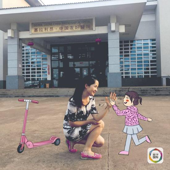 2017年,30歲的護士張曉在非洲塞拉利昂中塞友好醫(yī)院門前和自己女兒的畫像“合影”。