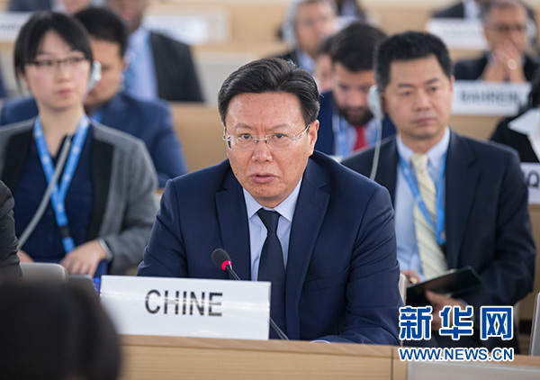 5月18日,在瑞士日內(nèi)瓦萬國宮,中國常駐聯(lián)合國日內(nèi)瓦辦事處和瑞士其他國際組織代表俞建華(中)出席聯(lián)合國人權(quán)理事會加沙局勢特別會議。新華社記者 徐金泉 攝