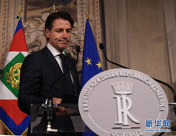 5月27日,在意大利首都羅馬,意新任總理孔特發(fā)表講話。據(jù)當?shù)孛襟w報道,孔特27日晚間與總統(tǒng)馬塔雷拉會面并提交擬定的內(nèi)閣成員名單時,馬塔雷拉否決了由意大利聯(lián)盟黨和五星運動力推的持疑歐立場的經(jīng)濟學(xué)家保羅·薩沃納出任財政部長??滋叵蚩偨y(tǒng)提出放棄組閣任務(wù)請求,請求得到總統(tǒng)確認。新華社發(fā)(阿爾貝托·林格里亞攝)