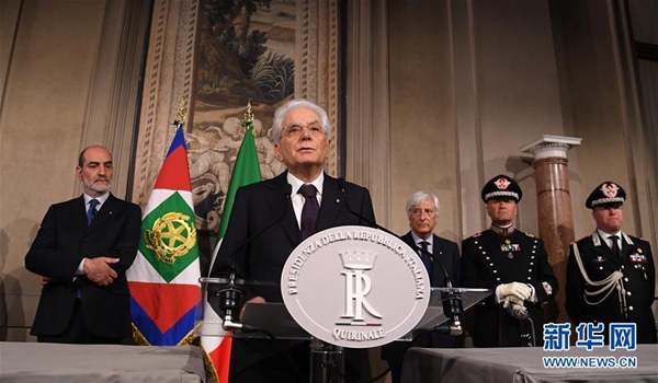 5月27日,在意大利首都羅馬,意總統(tǒng)馬塔雷拉發(fā)表講話。據(jù)當?shù)孛襟w報道,意大利新任總理孔特27日晚間與總統(tǒng)馬塔雷拉會面并提交擬定的內閣成員名單時,馬塔雷拉否決了由意大利聯(lián)盟黨和五星運動力推的持疑歐立場的經(jīng)濟學家保羅·薩沃納出任財政部長??滋叵蚩偨y(tǒng)提出放棄組閣任務請求,請求得到總統(tǒng)確認。新華社發(fā)(阿爾貝托·林格里亞攝)