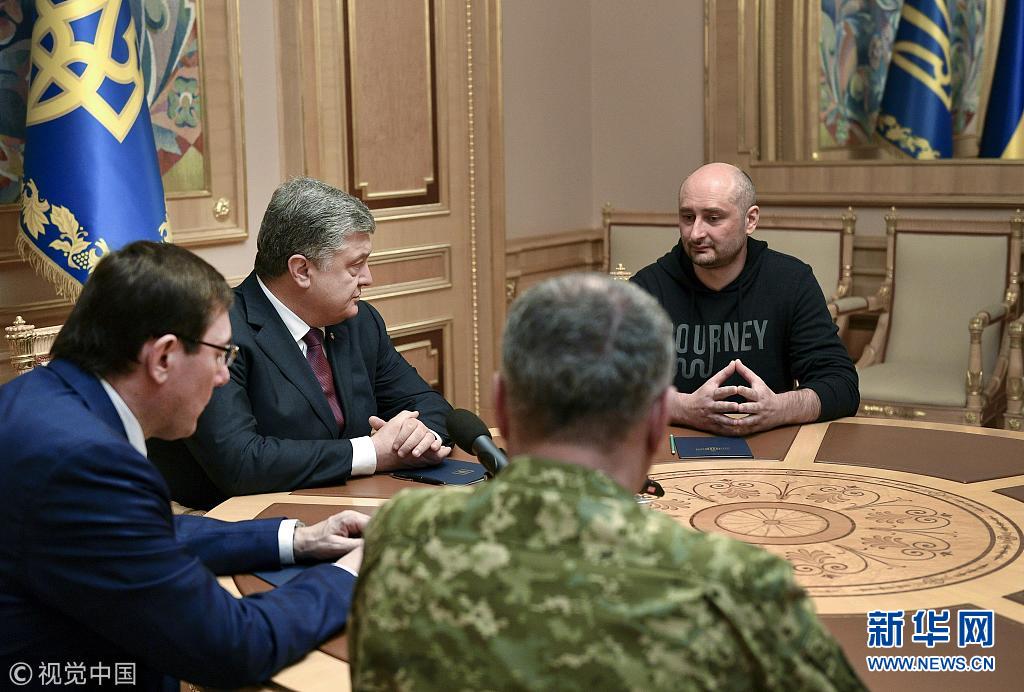 5月30日,烏克蘭基輔,烏克蘭總統(tǒng)波羅申科會見此前被報道“死亡”的俄羅斯記者巴布琴科。(圖片來源:視覺中國)