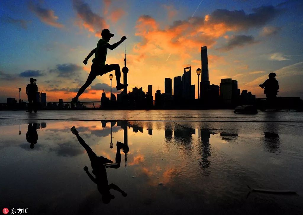 隨著暫短的陣雨飄過(guò),外灘天空飄過(guò)美麗的紅云,一位市民正在跑步。