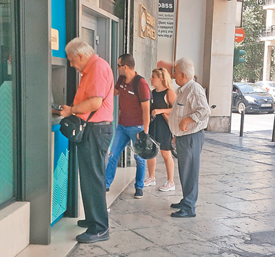 在希臘放松資本管制后,取款的希臘民眾增多。圖為雅典市民正在自動取款機前排隊取款。記者 葉琦攝