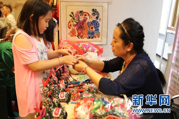蒙古國一位小觀眾體驗制作手鏈。新華網(wǎng)發(fā) 蘇力雅攝